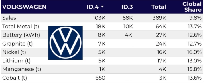 Despite selling half the number of BEVs than Tesla, thanks to the absence of LFP in its line-up, Volkswagen deployed more cobalt and on a relative basis more metals across its brands. That’s in part due to high-performance vehicles like the Porsche Taycan and Audi e-tron, some of which come equipped with higher nickel NCM batteries where cobalt can represent up to 20% of the metal mix.