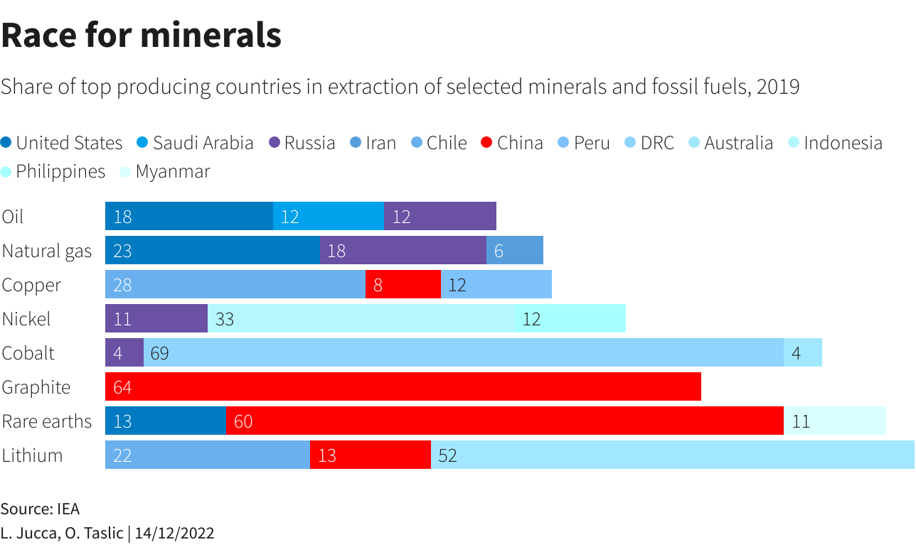 Europe needs to cumulatively spend $5.3 trillion on clean energy projects by 2050. That requires a sixfold increase in the global production of copper, lithium, graphite, nickel and some rare earths by 2040, International Energy Agency estimates show. Yet China dominates the processing, and to a lesser extent the extraction, of many critical industrial ingredients. It refines 58% of lithium produced globally, 65% of cobalt and over one-third of nickel and copper. Ostracised Russia is also big in nickel, palladium and cobalt. Europe, which imports between 75% and 100% of most metals, looks particularly vulnerable.