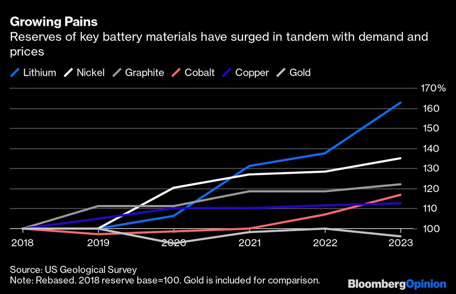 The latest figures show a boom in supplies of many of the most important minerals for the energy transition. Lithium reserves are up 18% from last year. Cobalt has seen a 9.2% gain. Rare earths, which have a range of high-tech applications including magnets in electric car motors and wind turbines, saw reserves up 8.3% after standing still for at least five years.