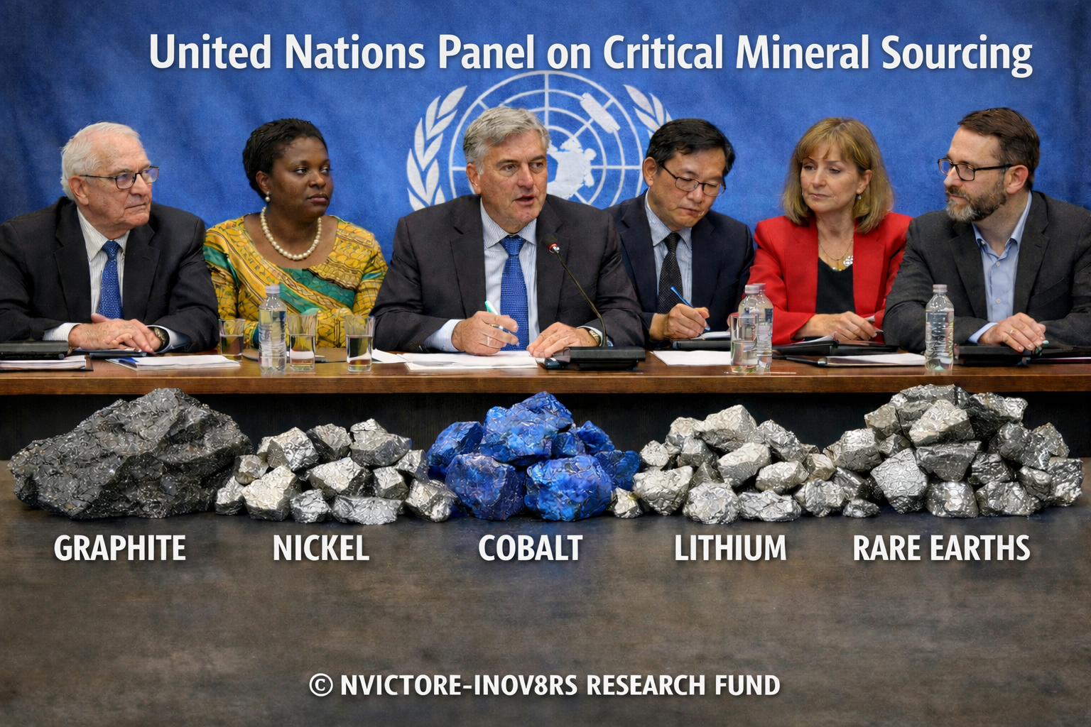 United Nations Panel on Critical Mineral Sourcing featuring six panelists discussing critical minerals: graphite, nickel, cobalt, lithium, and rare earths, with minerals displayed on the table.