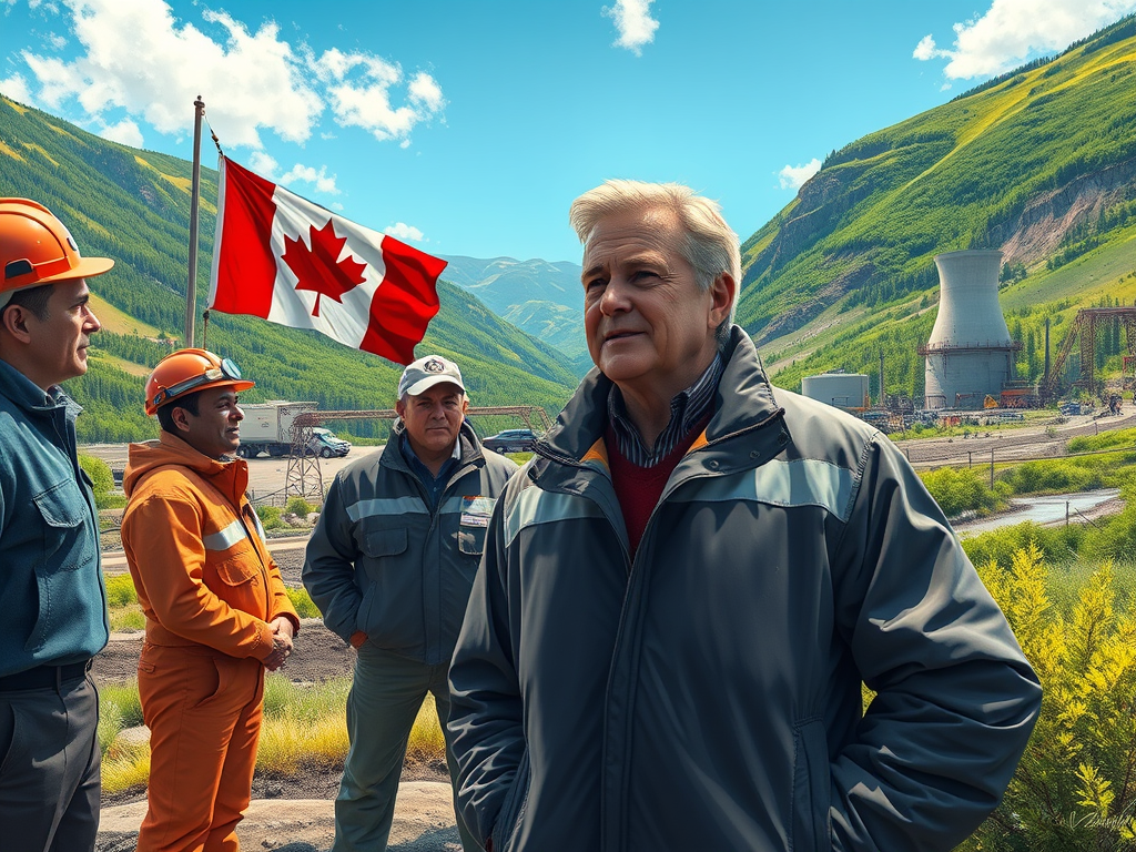 Two workers in safety vests observing a Canadian flag at a mining site surrounded by mountains and machinery.