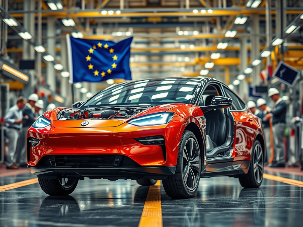 A red electric car with an open door is showcased in a manufacturing facility. The background features workers and an European Union flag, emphasizing the automotive industry's focus on electric vehicle production.