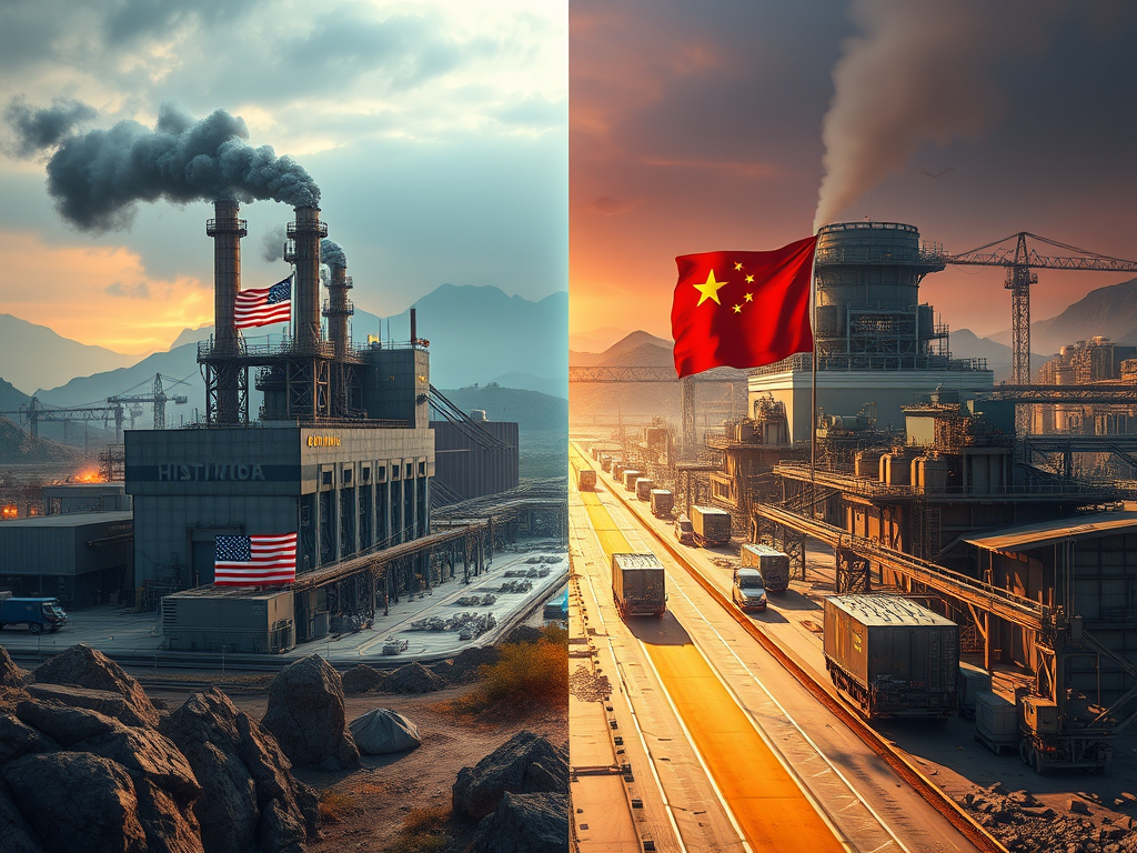 A split image showing an industrial scene with a factory featuring the American flag on the left, and another factory with the Chinese flag on the right, both smoking chimneys and trucks on a road, against a mountainous backdrop.