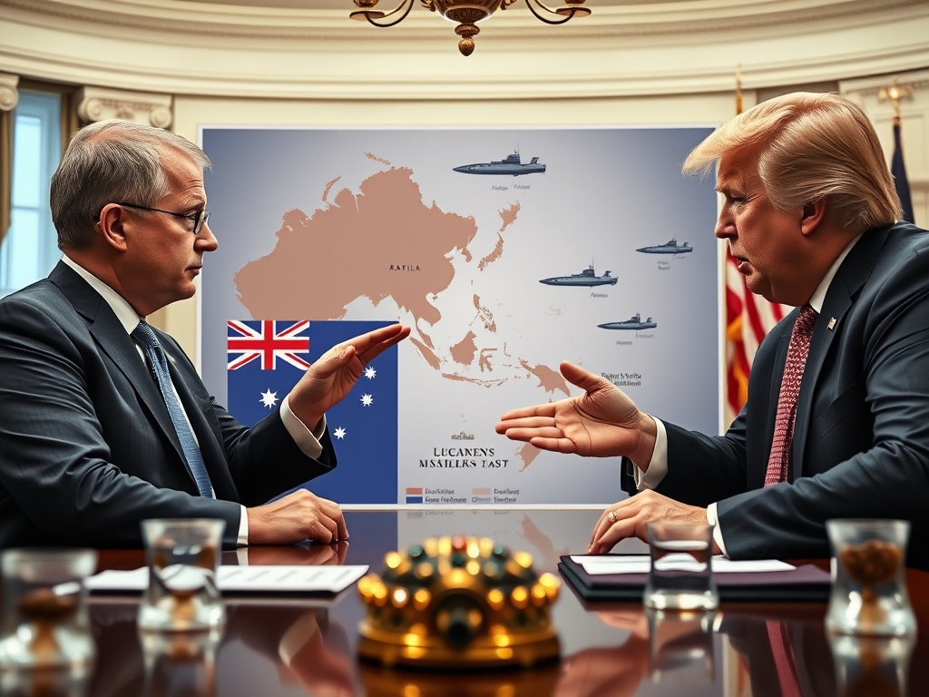 Australian Prime Minister Anthony Albanese and President Donald Trump engaged in a discussion at the White House, with a map of the Pacific and Australian flag visible in the background.