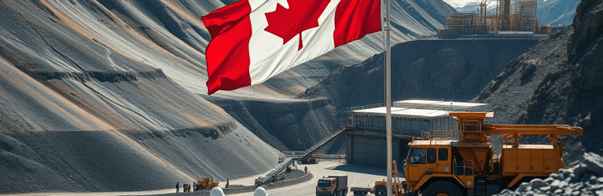 Two workers in safety vests observing a Canadian flag at a mining site surrounded by mountains and machinery.
