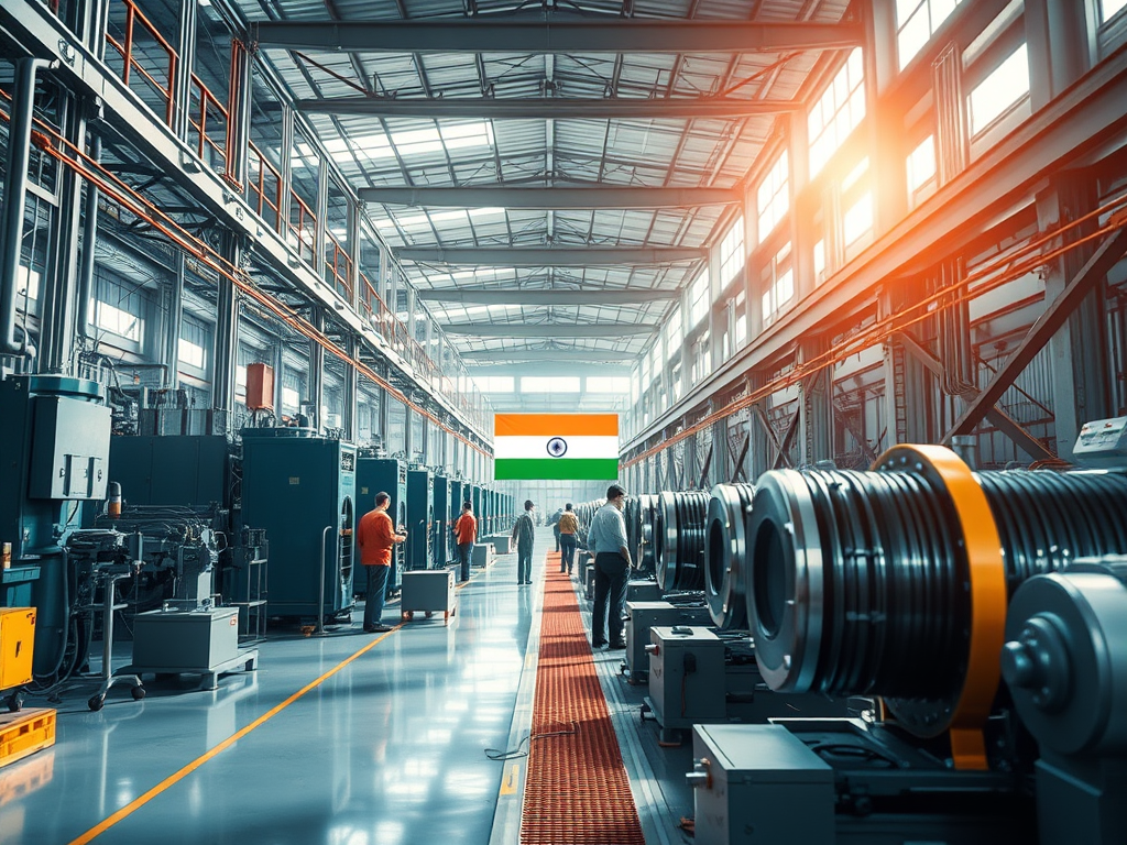 A manufacturing facility in India with workers, machines, and an Indian flag displayed prominently.
