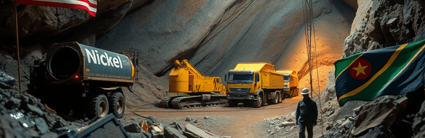 An underground mining scene showcasing a nickel deposit, featuring mining trucks, machinery, and flags representing the U.S. and a country with a green, yellow, and red design.
