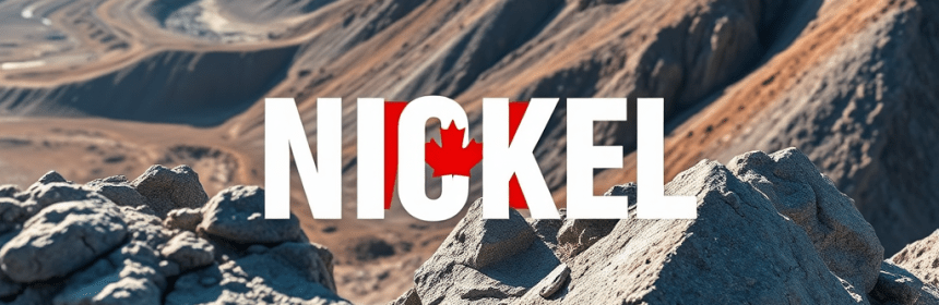 A close-up view of rocky terrain with the word 'NICKEL' prominently featured, incorporating a maple leaf design and a Canadian flag in the corner.